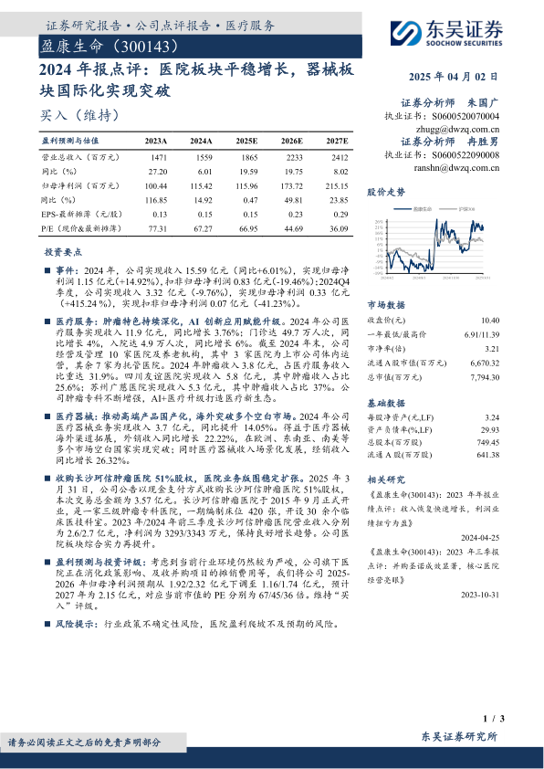 公司通过收购长沙珂信肿瘤医院,进一步扩张了医院业务版图。然而,考虑到行业政策影响和并购项目摊销费用,报告下调了未来两年的盈利预期,并提示了相关风险,维持“买入”评级。