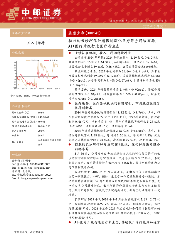 盈康生命通过内生增长和外延扩张,不断完善其在医疗服务和医疗器械领域的布局。公司2024年业绩稳健,各业务板块均实现增长。拟收购长沙珂信肿瘤医院将进一步增强其在肿瘤专科领域的实力。同时,公司积极拥抱AI技术,提升诊疗效率和服务能力,为未来的可持续发展奠定了坚实基础。维持“买入”评级,是基于对公司未来发展潜力的认可。