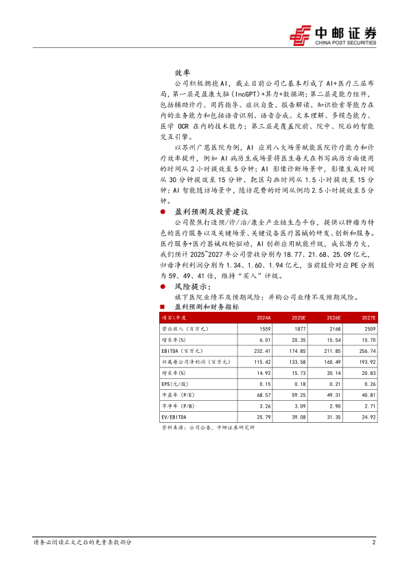 公司聚焦打造预/诊/治/康全产业链生态平台,提供以肿瘤为特色的医疗服务以及关键场景、关键设备医疗器械的研发、创新和服务。医疗服务+医疗器械双轮驱动,AI创新应用赋能升级,成长潜力大,我们预计2025~2027年公司营收分别为18.77、21.68、25.09亿元,归母净利利润分别为1.34、1.60、1.94亿元,当前股价对应PE分别为59、49、41倍,维持“买入”评级。