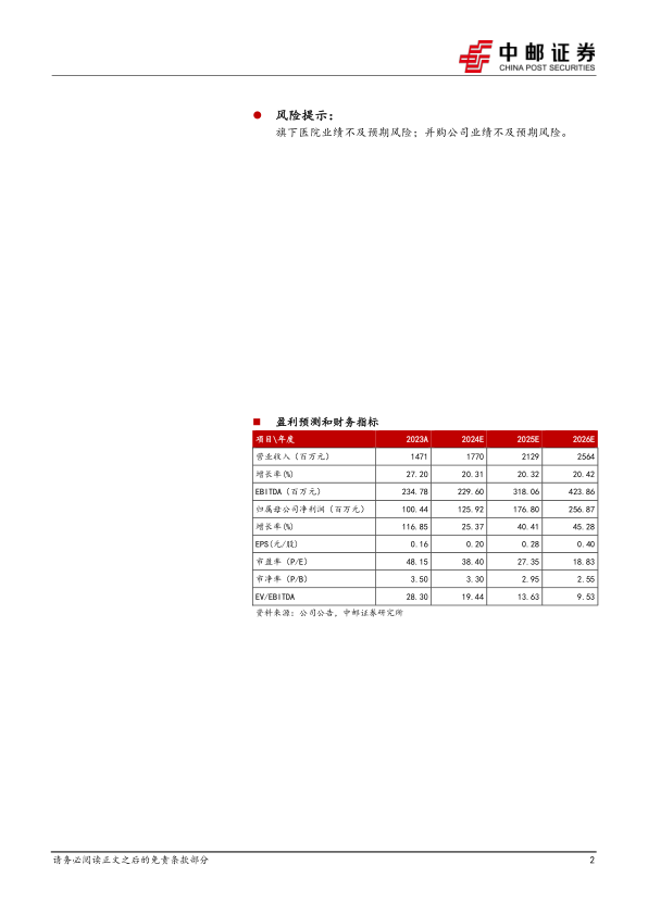 旗下医院业绩不及预期风险;并购公司业绩不及预期风险。