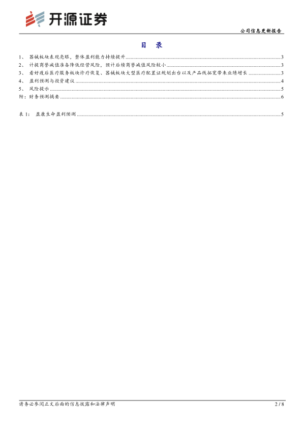公司通过大规模计提商誉减值准备,有效降低了未来经营风险,预计后续商誉减值风险较小。展望未来,随着疫后医疗服务板块诊疗量的恢复、医疗器械板块大型医疗配置证规划的出台以及产品线的持续拓宽,公司业绩有望迎来拐点。开源证券上调了盈康生命2023-2025年归母净利润预测,并维持“买入”评级,看好公司在海尔控股后聚焦肿瘤+康复医疗赛道,通过“1+N+n+H”布局实现器械与服务一体化,提升规模效应和未来扩张空间。