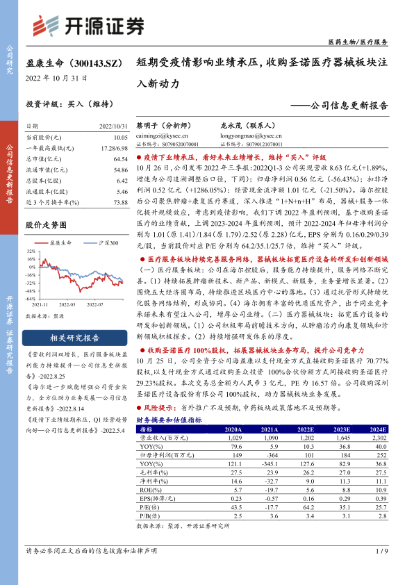 盈康生命在2022年前三季度面临疫情带来的业绩压力,归母净利润同比下降,但通过剥离亏损资产,扣非净利润实现显著增长,显示出公司经营效率的提升。公司战略聚焦肿瘤与康复医疗,持续完善医疗服务网络,并通过托管模式优化布局。同时,公司积极拓展医疗器械业务,加大研发投入,并成功收购圣诺医疗100%股权,此举不仅拓宽了产品线,强化了肿瘤全链条服务能力,更预计将为公司未来业绩增长注入强劲动力。尽管短期业绩承压,但基于其战略转型和新业务注入,公司未来盈利能力有望逐步恢复并实现增长,因此维持“买入”评级。需关注并购医院业绩及伽玛刀销售不及预期的风险。