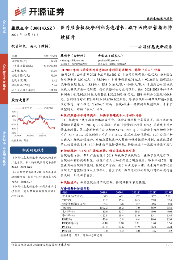 10月28日,公司发布2021年三季报:2021Q1-3公司实现营收4.92亿元(+0.84%);归母净利润1.00亿元(+135.94%);扣非净利润0.04亿元(-92.26%);经营现金流净额0.78亿元(-3.81%);EPS0.16元/股(+0.09元/股)。考虑到公司器械板块收入确认需要一定周期,我们调整对公司盈利预测,预计2021-2023年归母净利润由1.61/2.92/3.94亿元调整至1.37/2.56/3.48亿元,EPS分别为0.21/0.40/0.54元,当前股价对应P/E分别为67.9/36.3/26.8倍。海尔控股后公司聚焦肿瘤+康复医疗赛道,深入推进“1+N+n”布局,器械+服务一体化提升规模效应,未来扩张空间大,维持“买入”评级。