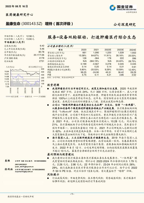 盈康生命作为“物联网肿瘤治疗康复综合生态品牌”,在肿瘤医疗领域具有显著的发展潜力。公司通过服务+设备双轮驱动,打造肿瘤医疗综合生态,并借助海尔集团的赋能,有望实现业绩的持续增长。报告首次覆盖给予“增持”评级,目标价13.9元/股。