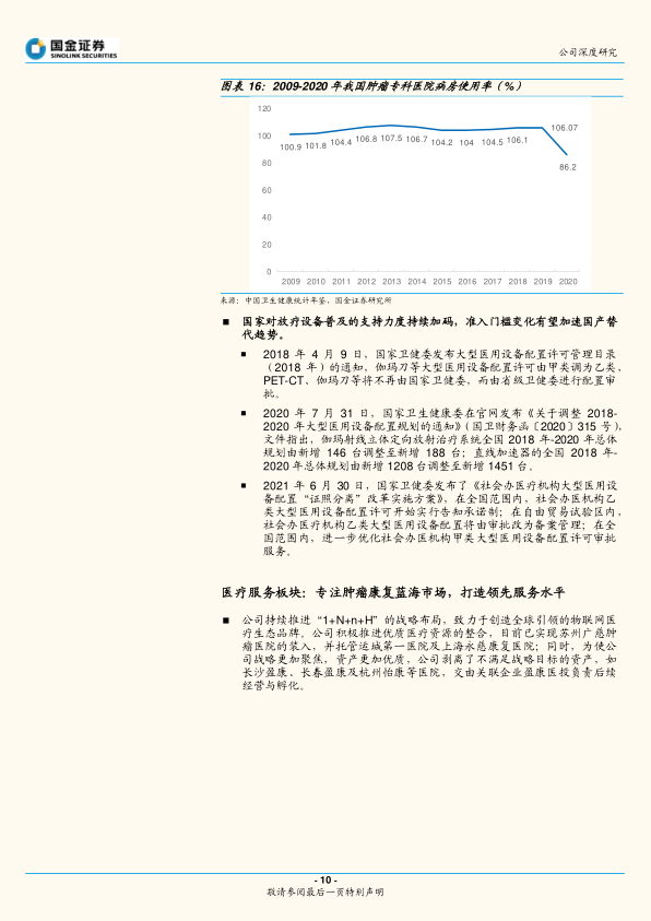 我国肿瘤医疗行业市场空间巨大,政策支持加速行业发展。2020年我国新发癌症457万例,占全球24%,死亡300万例,位居全球第一。在人口老龄化加剧背景下,我国肿瘤负担逐年加重,肿瘤专科医院病房使用率常年保持在100%以上的高负荷运作状态。近年来,国家陆续出台大型医用设备配置政策,在规范行业的同时调整准入门槛,显现出政策松绑态势。