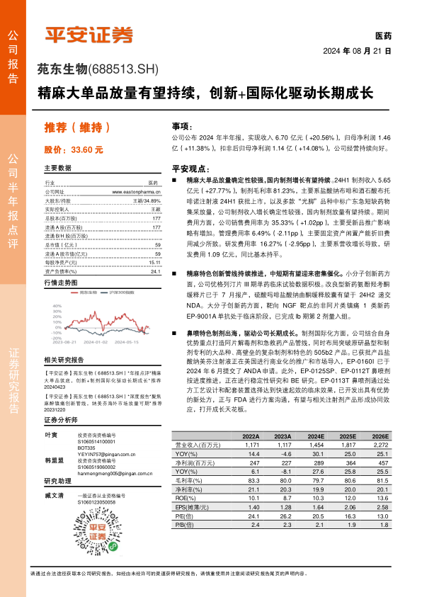 苑东生物2024年半年报显示公司经营状况良好,精麻大单品放量确定性强,国内制剂增长有望持续。公司在创新药研发和制剂国际化方面均取得积极进展,有望驱动公司实现长期成长。平安证券维持对公司“推荐”评级,并提示了研发、新品种放量和制剂出口等方面的风险。