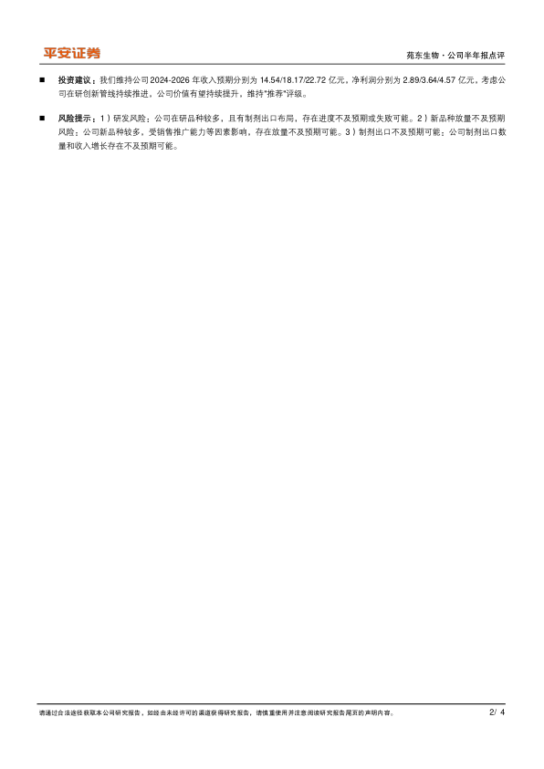 风险提示:1)研发风险:公司在研品种较多,且有制剂出口布局,存在进度不及预期或失败可能。2)新品种放量不及预期风险:公司新品种较多,受销售推广能力等因素影响,存在放量不及预期可能。3)制剂出口不及预期可能:公司制剂出口数量和收入增长存在不及预期可能。