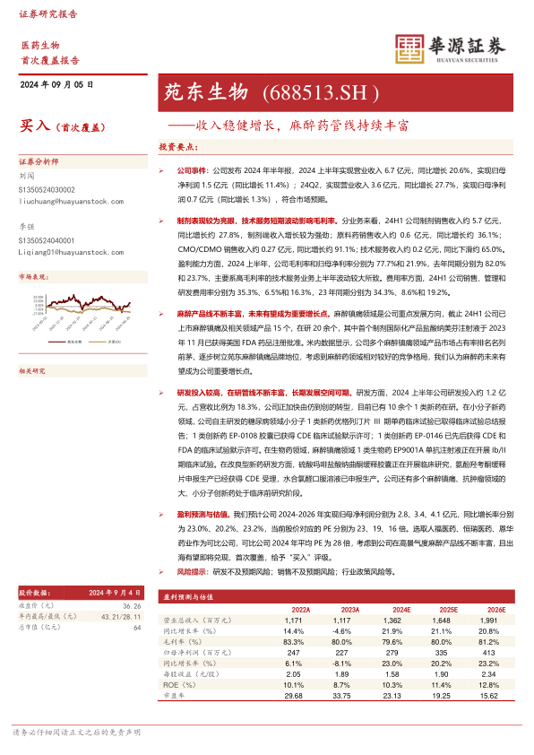 盈利预测与估值。我们预计公司2024-2026年实现归母净利润分别为2.8、3.4、4.1亿元,同比增长率分别为23.0%、20.2%、23.2%,当前股价对应的PE分别为23、19、16倍。选取人福医药、恒瑞医药、恩华药业作为可比公司,可比公司2024年平均PE为28倍,考虑到公司在高景气度麻醉产品线不断丰富,且出海有望即将兑现,首次覆盖,给予“买入”评级。