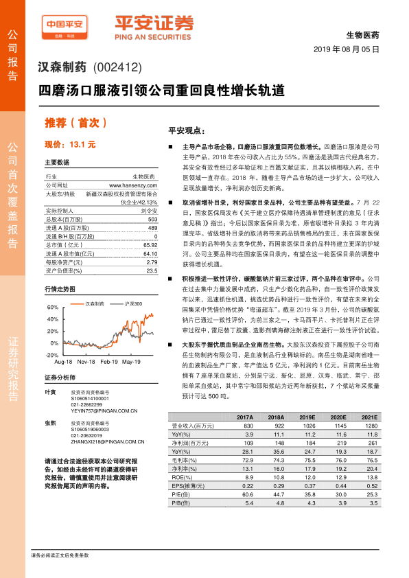 基于公司向基层和OTC加强销售的策略稳步推进并取得成效,以及公司长期的品牌价值,我们预计公司主要品种在未来几年稳步增长,2019-2021年销售收入增速分别为11.2%、11.6%、11.8%。预计2019-2021年EPS分别为0.37、0.44、0.52元,对应PE分别为36X/30X/25X,首次覆盖给予“推荐”评级。