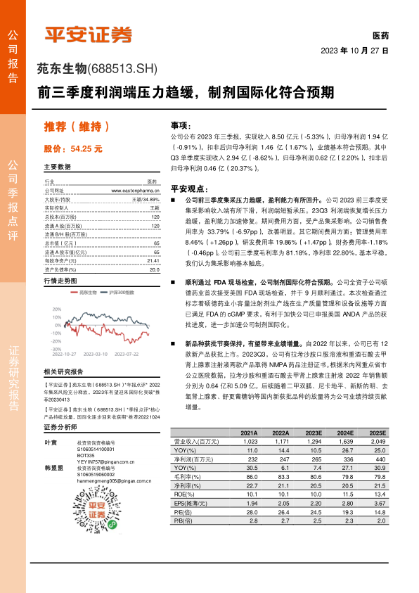 苑东生物2023年三季报显示,公司在集采压力下利润端压力趋缓,盈利能力有所回升。子公司通过FDA现场检查,为制剂国际化奠定基础。同时,公司持续有新产品获批上市,有望带来业绩增量。平安证券维持对公司“推荐”评级,但提醒投资者关注研发风险、新品种放量不及预期以及制剂出口不及预期等风险。