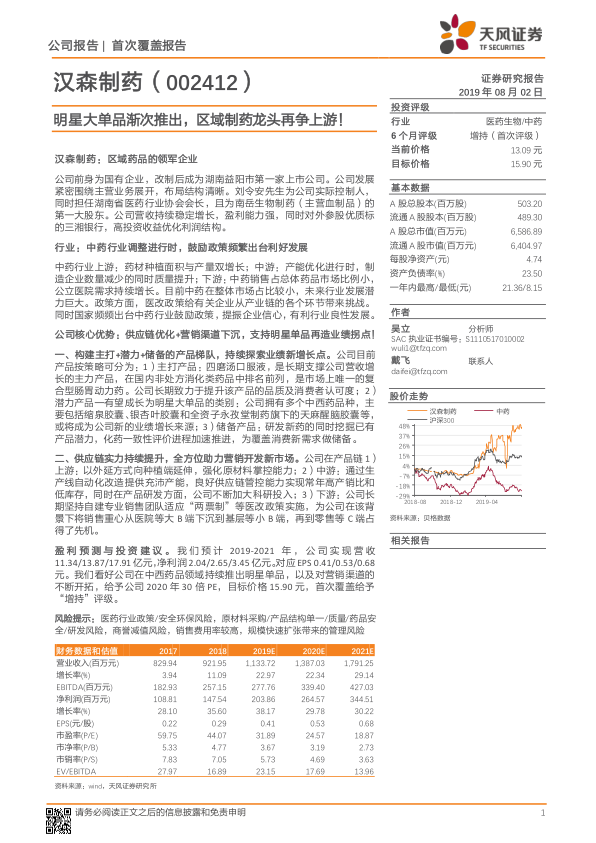 根据对公司各项业务的盈利预测假设,预计2019-2021年,公司营收将分别达到11.34亿元、13.87亿元和17.91亿元,净利润分别为2.04亿元、2.65亿元和3.45亿元,对应EPS分别为0.41元、0.53元和0.68元。 基于汉森制药历史估值水平(上市以来PE平均50倍)和中成药制造板块内主营业务近似的上市公司(如寿仙谷、片仔癀、同仁堂等,2020年一致预测PE平均25倍)的平均估值水平,报告给予公司2020年30倍PE,目标价格15.90元,首次覆盖给予“增持”评级。
