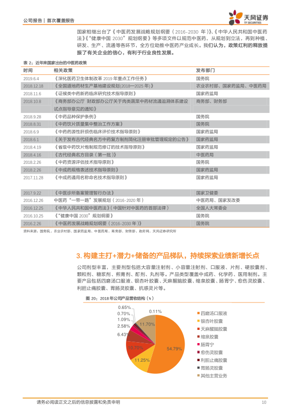 挑战: 医改政策如“两票制”、带量采购、价格联动、医保目录调整和医保控费等,给医药企业从产业链各环节带来挑战,要求企业调整供应链以适应政策。 机遇: 国家频繁出台中药行业鼓励政策,如《中医药发展战略规划纲要(2016-2030年)》、《中华人民共和国中医药法》等,从规划到立法,再到种植、研发、生产、流通各环节全方位助推中医药产业成长,提振了企业信心,有利于行业良性发展。