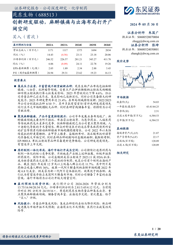 盈利预测与投资评级:我们预计公司2024-2026年营收分别为13.75/16.94/20.34亿元,归母净利润分别为2.81/3.45/4.12亿元,当前股价对应PE分别为24/19/16×。考虑到苑东生物存量品种集采出清,重点聚焦麻醉镇痛领域,储备管线丰富,出海逐步兑现,首次覆盖,给予“买入”评级。