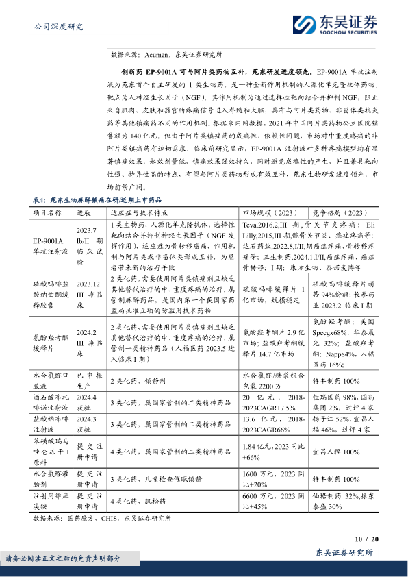 在创新药研发方面,EP-9001A单抗注射液是苑东生物首个自主研发的1类生物药,靶点为人神经生长因子(NGF),目前处于Ib/II期临床阶段。该药物通过选择性靶向结合并抑制NGF,具有与阿片类药物不同的作用机制,可避免成瘾性,有望与阿片类药物形成有效互补,市场前景广阔。此外,公司还陆续获批了多款白处方/红处方产品,如盐酸纳布啡注射液(2024年3月获批,2023年市场规模13.6亿元)和酒石酸布托啡诺注射液(2024年4月获批,2023年市场规模20.0亿元),这些产品竞争格局较好且市场规模快速增长,有望为公司贡献可观增量。硫酸吗啡盐酸纳曲酮缓释胶囊(2类化药,2023年12月进入III期临床)是国内第一个获国家药监局批准立项的防滥用技术药物,而氨酚羟考酮缓释片(2类化药,2024年2月进入III期临床)则有望凭借其复方制剂优势和术后镇痛适应症,在现有14.7亿元盐酸羟考酮缓释片和2.9亿元氨酚羟考酮片市场中获得新的业绩增量。