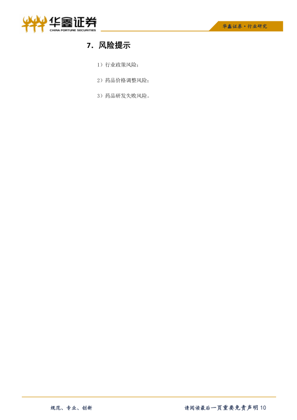 报告提示了行业政策风险、药品价格调整风险以及药品研发失败风险。