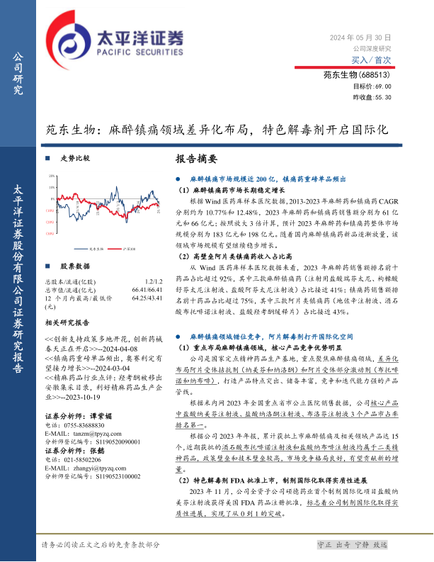 考虑公司麻醉镇痛新品逐步放量,国际化业务刚开始推进,我们给予公司2024年30倍PE估值,对应市值82.8亿,对应目标价69.00元,估值空间26%。首次覆盖,给予“买入”评级。