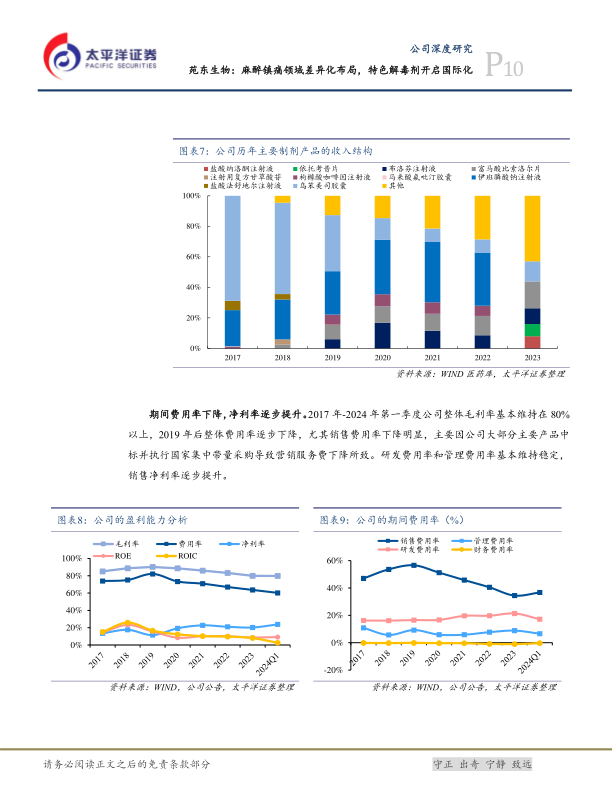 从业务板块来看,化学制剂是公司主要收入来源,2023年实现收入8.81亿元,占比78.84%,2017-2023年CAGR约12.14%。原料药和技术服务板块增长较快,同期CAGR分别约为27.38%和51.77%。在制剂分类中,麻醉镇痛药物(如布洛芬注射液、盐酸纳洛酮注射液、依托考昔片等)的收入占比逐步提升。公司整体毛利率在2017-2024年第一季度基本维持在80%以上,期间费用率逐步下降,尤其销售费用率因集采导致营销服务费下降而明显降低,销售净利率逐步提升。公司积极回报投资者,近三年现金分红比例平均超过净利润的30%。