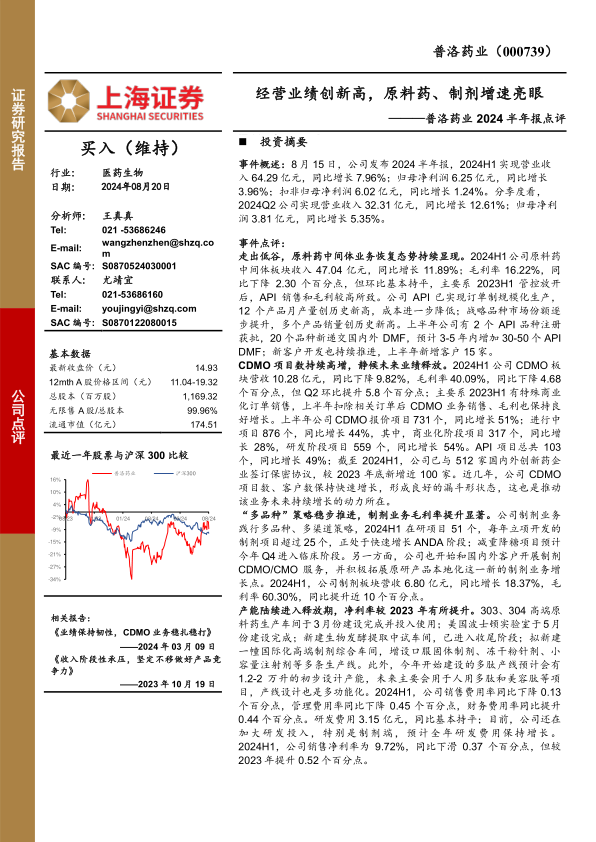 普洛药业2024半年报点评:经营业绩创新高,原料药、制剂增速亮眼
