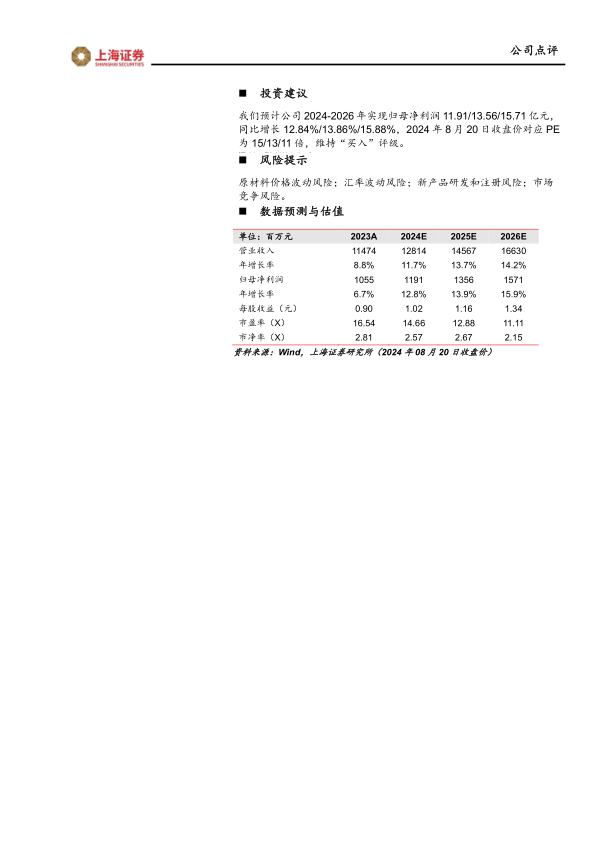 我们预计公司2024-2026年实现归母净利润11.91/13.56/15.71亿元,同比增长12.84%/13.86%/15.88%,2024年8月20日收盘价对应PE为15/13/11倍,维持“买入”评级。