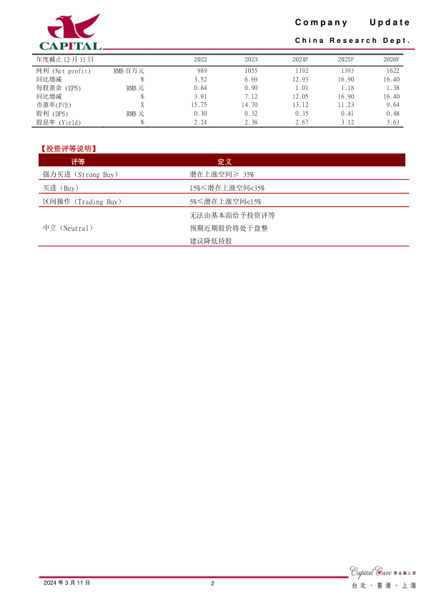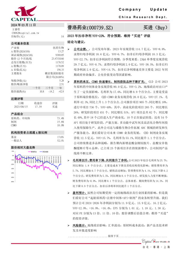 盈利预计:虽然公司短期受到一定的地缘政治及行业因素的影响,但是我们看好公司“起始原料药+注册中间体+API+制剂”的业务转型升级。我们预计公司2024-2026年净利润分别为11.9亿元、13.9亿元、16.2亿元,YOY+12.9%、+16.9%、+16.4%,EPS分别为1.01元、1.18元、1.38元,对应PE分别为13倍、11倍、10倍,股价调整后估值合理,维持“买进”的投资评级。
