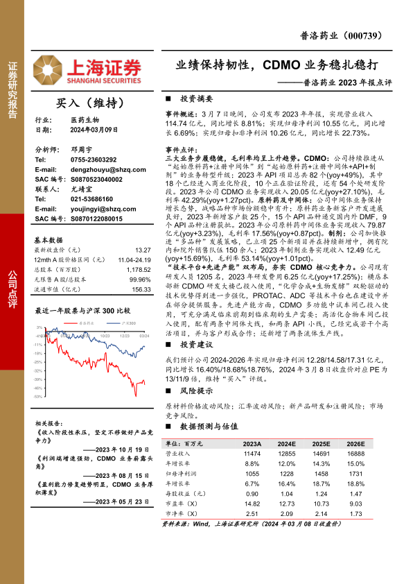 普洛药业2023年业绩稳健增长,CDMO业务表现亮眼,成为公司发展的重要驱动力。公司通过“技术平台+先进产能”双轮驱动,不断夯实CDMO核心竞争力。维持“买入”评级。