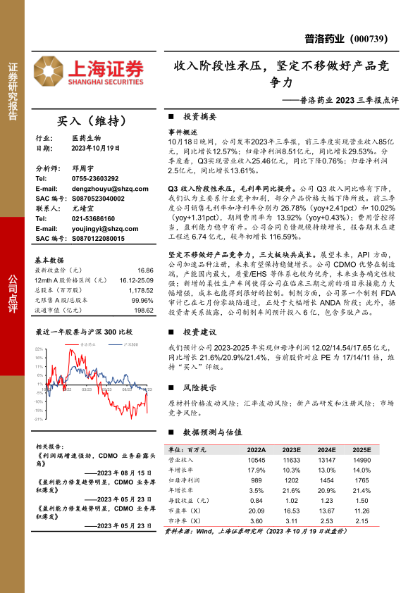 本报告分析了普洛药业2023年三季报,指出公司Q3收入虽阶段性承压,但盈利能力有所提升。公司在API、CDMO和制剂三大板块均有布局,通过提升产品竞争力,有望实现长期增长。维持“买入”评级,但需关注原材料价格、汇率、新产品研发和市场竞争等风险。