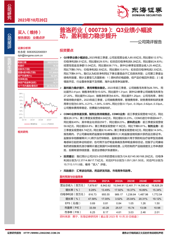 普洛药业2023年前三季度业绩稳健增长,盈利能力稳步提升。CDMO业务快速发展,成为公司增长的重要驱动力,同时制剂业务也在持续推进。公司整体费用率稳定,控费能力持续向好。维持“买入”评级,但需关注汇率波动、药品研发和市场竞争等风险。