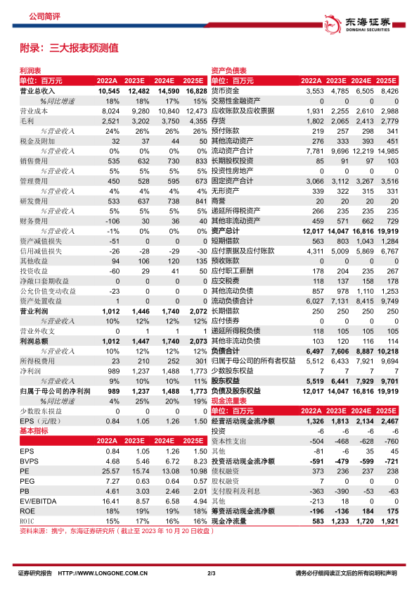 盈利能力稳步提升, 费用率整体稳定。 2023年前三季度,公司销售毛利率为26.78%,同比提升2.41pct;销售净利率为10.02%,同比提升1.31pct; 其中Q3单季公司销售毛利率为27.20%,同比提升4.22pct;销售净利率为9.83%,同比提升1.25pct;公司毛利率、净利率保持稳步提升。 2023年前三季度, 公司销售费用率、管理费用率、财务费用率和研发费用率分别为5.06%、4.21%、-1.04%、5.69%,同比分别-0.17pct、-0.35pct、0.62pct、0.33pct。公司整体费用率稳定,控费能力持续向好。
