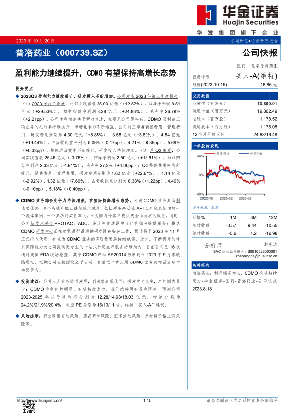 普洛药业在2023年前三季度表现出良好的盈利能力和增长态势,主要得益于原料药、CDMO及制剂三大业务的毛利率持续提升。公司不断加大研发投入,提升运营效率,CDMO业务的竞争优势显著,通过产能扩张、技术平台建设和全球拓展,有望保持高增长。维持“买入-A”评级,但需关注行业政策、研发、汇率和原材料价格等风险。