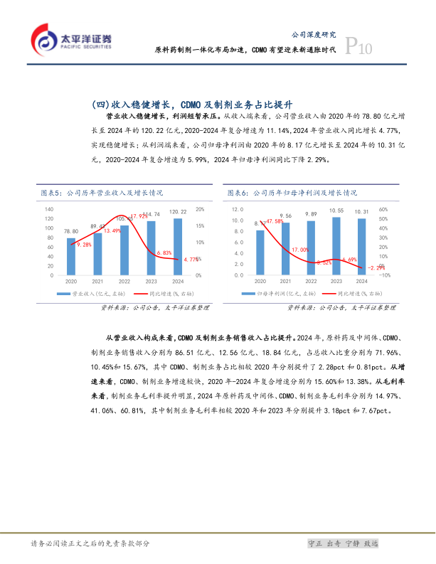 我们预测公司2025/26/27年收入为130.58/143.93/159.58亿元,归母净利润为11.53/13.24/15.48亿元,对应当前PE为16/13/12X,考虑到CDMO有望迎来新通胀时代,公司研发阶段项目高速增长,CDMO业务将逐步进入收获期,同时原料药制剂一体化布局加速,随着CDMO及制剂业务占比提升,公司利润增长有望提速,估值应具备溢价,维持“买入”评级。