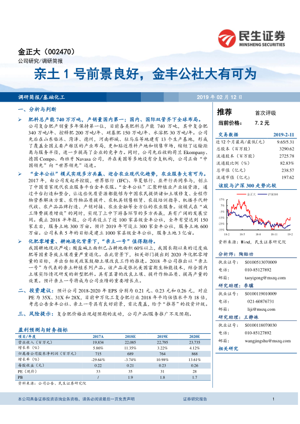 基于对金正大公司业务发展前景的分析,民生证券研究院对公司未来的盈利能力进行了预测。预计公司2018年至2020年的每股收益(EPS)分别为0.21元、0.23元和0.26元。根据当时的股价(7.2元),对应的市盈率(PE)分别为35倍、31倍和28倍。报告同时指出,申万化工复合肥行业2018年的平均估值水平为18倍。尽管金正大的预测PE高于行业平均水平,但考虑到“金丰公社”模式和“亲土一号”产品所展现出的良好前景和巨大的增长潜力,分析师首次覆盖并给予了“推荐”的投资评级,表明对公司未来发展持乐观态度。