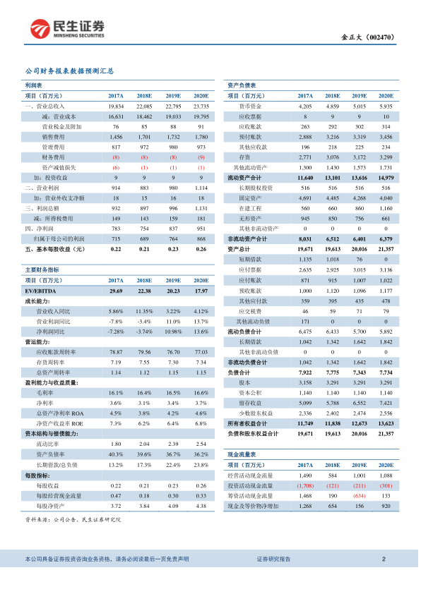 从财务数据来看,金正大在2017年至2020年的营业收入呈现稳健增长态势。2017年营业收入为19,834百万元,预计2018年增长至22,085百万元(增长率11.35%),2019年和2020年将继续增长至22,795百万元(增长率3.22%)和23,735百万元(增长率4.12%)。归属于母公司股东的净利润方面,2017年为715百万元,预计2018年略有下降至689百万元(下降3.74%),但随后在2019年和2020年将恢复增长,分别达到764百万元(增长10.98%)和868百万元(增长13.61%)。这表明公司在经历短期调整后,预计将重回盈利增长轨道。