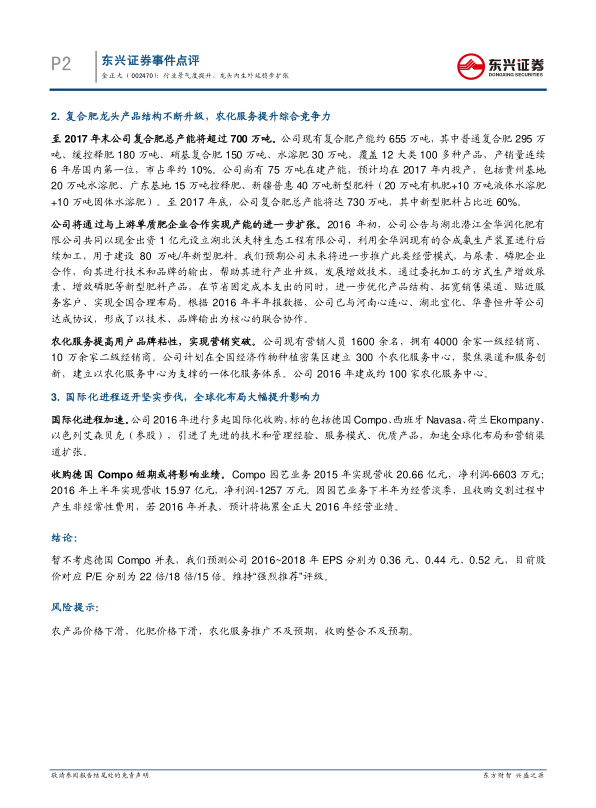 暂不考虑德国Compo并表,预测金正大2016~2018年EPS分别为0.36元、0.44元、0.52元,维持“强烈推荐”评级。
