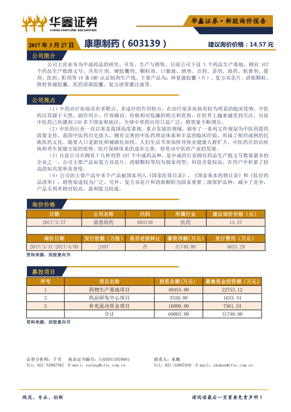 新股询价报告:康惠制药