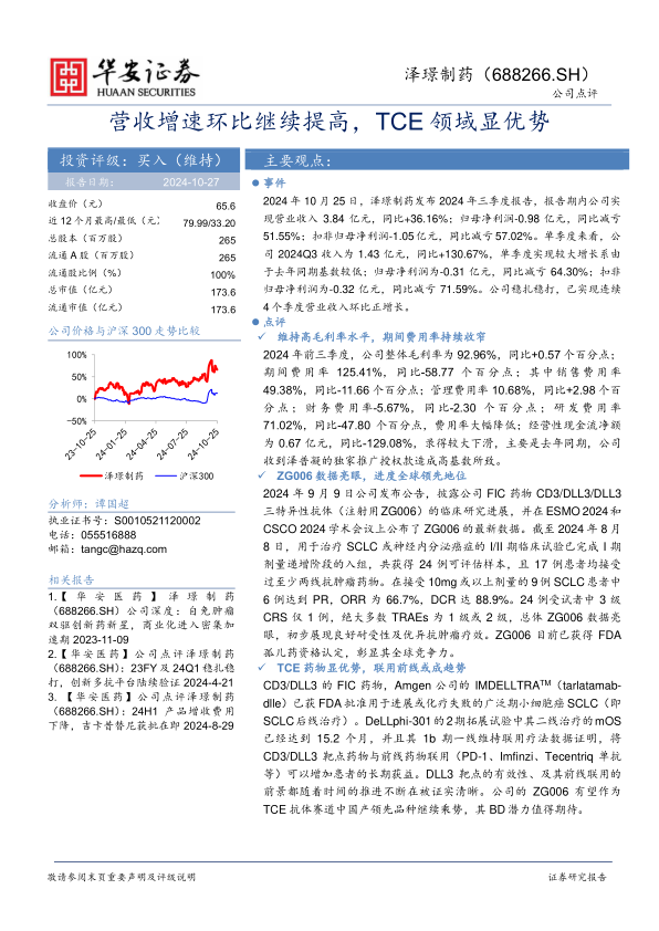 本报告分析指出,泽璟制药在2024年三季度取得了营收增长和盈利改善的成绩,尤其是在 TCE 药物 ZG006 的临床数据上表现亮眼,具有全球领先地位。维持“买入”评级,但同时也提示了新药研发、审批准入、行业政策和销售等方面的风险。