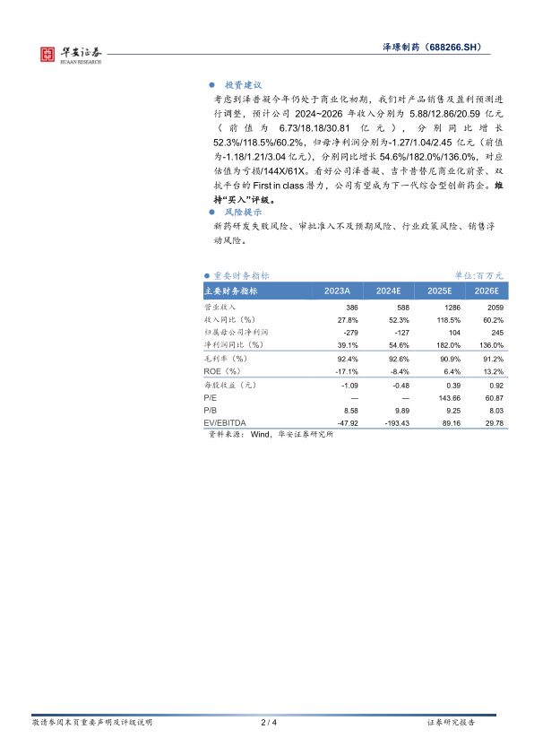 考虑到泽普凝今年仍处于商业化初期,我们对产品销售及盈利预测进行调整,预计公司2024~2026年收入分别为5.88/12.86/20.59亿元(前值为6.73/18.18/30.81亿元),分别同比增长52.3%/118.5%/60.2%,归母净利润分别为-1.27/1.04/2.45亿元(前值为-1.18/1.21/3.04亿元),分别同比增长54.6%/182.0%/136.0%,对应估值为亏损/144X/61X。看好公司泽普凝、吉卡昔替尼商业化前景、双抗平台的First in class潜力,公司有望成为下一代综合型创新药企。维持“买入”评级。