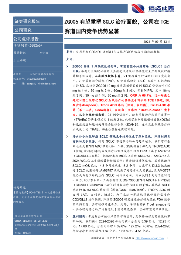 ZG006有望重塑SCLC治疗面貌,公司在TCE赛道国内竞争优势显著