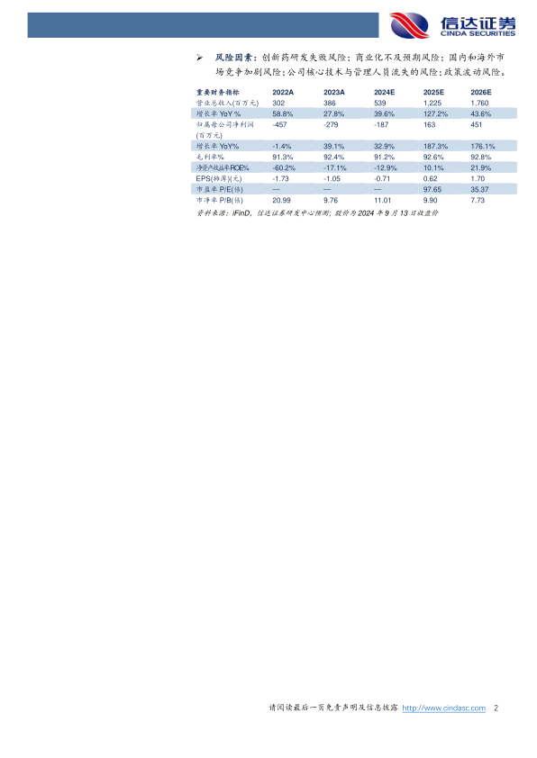 风险因素:创新药研发失败风险;商业化不及预期风险;国内和海外市场竞争加剧风险;公司核心技术与管理人员流失的风险;政策波动风险。