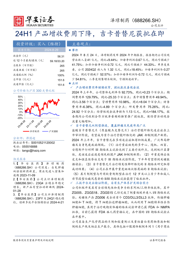 泽璟制药在2024年上半年实现了显著的财务改善,营收增长加速,亏损大幅收窄,经营性现金流因授权款而大幅提升。公司核心产品吉卡昔替尼在骨髓纤维化及多项自身免疫疾病适应症上取得突破性进展,有望成为市场领导者。同时,三特异性抗体平台,特别是全球首创的ZG006,正逐步进入临床验证阶段,展现出强大的创新能力。结合自有生产体系的扩充,泽璟制药正加速向综合型创新制药企业转型。尽管面临新药研发和市场准入等风险,但其丰富的创新管线和商业化前景为公司带来了强劲的长期增长驱动力,维持“买入”评级。