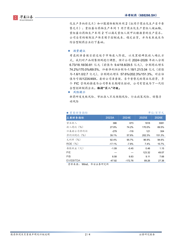 考虑到泽普凝目前还处于市场进入阶段,以及里程碑款收入确认方式,我们对产品销售预测进行调整,预计公司2024~2026年收入分别6.73/18.18/30.81亿元(前值为9.4/18.8/29.5亿元),分别同比增长74.2%/170.0%/69.5%,归母净利润分别为-1.18/1.21/3.04亿元(前值为-1.6/1.0/2.7亿元),分别同比增长57.6%/202.3%/151.3%,对应估值为亏损/123X/49X。看好公司泽普凝、吉卡昔替尼的商业化前景,多个FIC管线的推进为公司带来长期增长驱动,公司有望成为下一代综合型创新制药企业。维持“买入”评级。