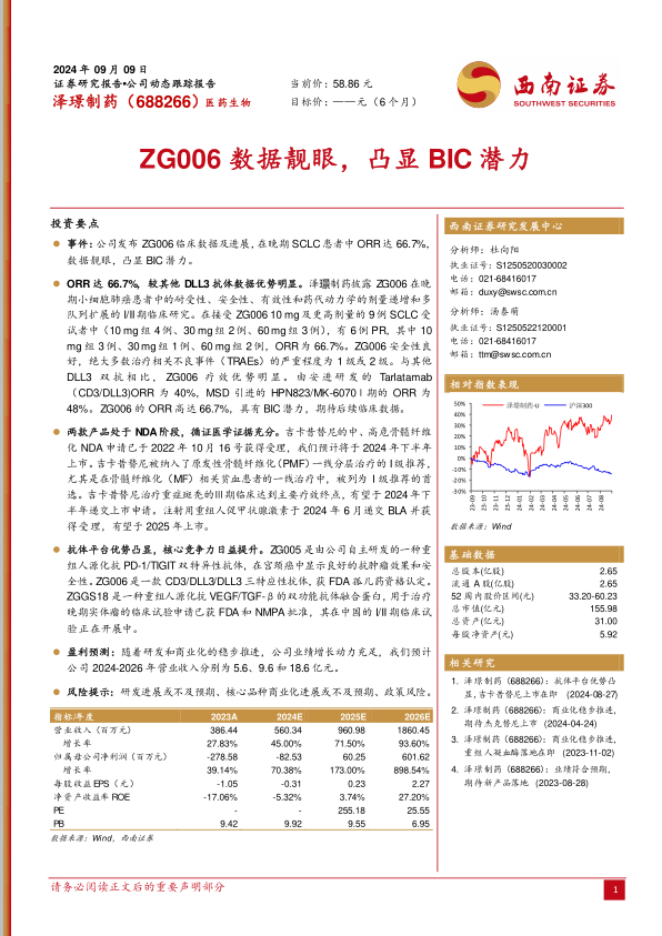 本报告的核心观点是泽璟制药的 ZG006 在晚期小细胞肺癌(SCLC)治疗中显示出巨大的 BIC(Best in Class)潜力。临床数据显示,ZG006 的 ORR(客观缓解率)高达 66.7%,显著优于其他同类 DLL3 抗体药物。