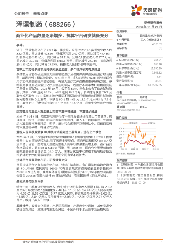 本报告对泽璟制药2023年三季度报进行了分析,核心观点如下: