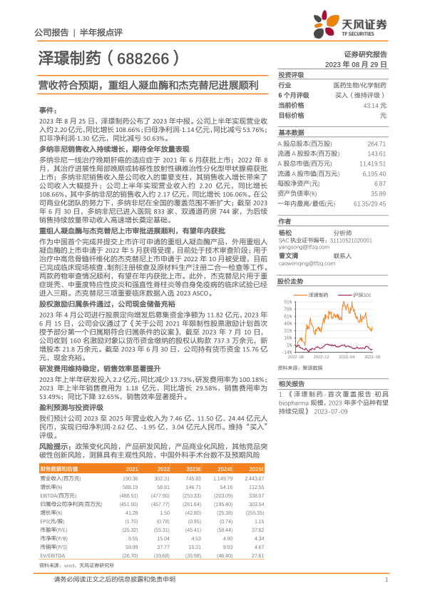 本报告分析了泽璟制药2023年中报,指出公司营收大幅增长主要受益于多纳非尼的销售增长,新药审批进展顺利,财务状况良好。维持“买入”评级,但同时也提示了政策、研发、商业化等多方面的风险。
