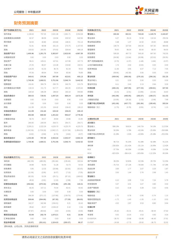 我们预计公司2023至2025年营业收入为7.46亿、11.50亿、24.44亿元人民币,实现归母净利润-2.62亿、-1.95亿、3.04亿元人民币。维持“买入”