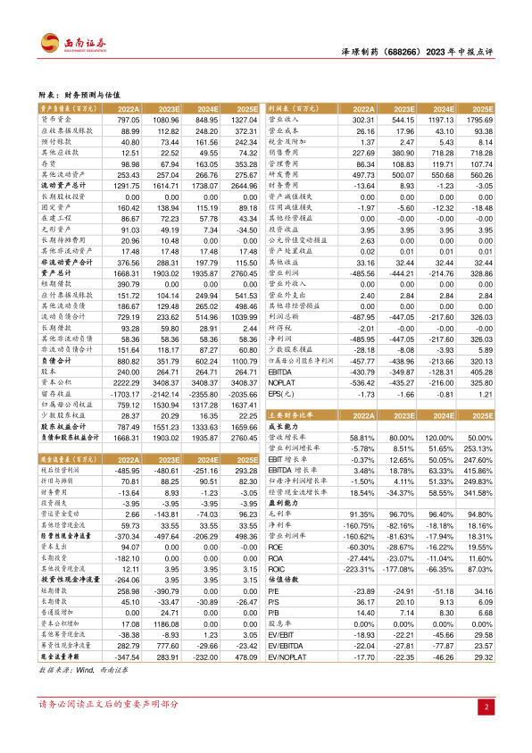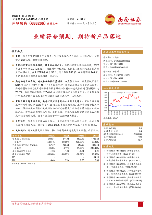 根据公司发布的2023年半年度报告,泽璟制药实现营业收入2.2亿元,同比大幅增长108.7%,研发费用同期为2.2亿元,整体业绩符合市场预期。