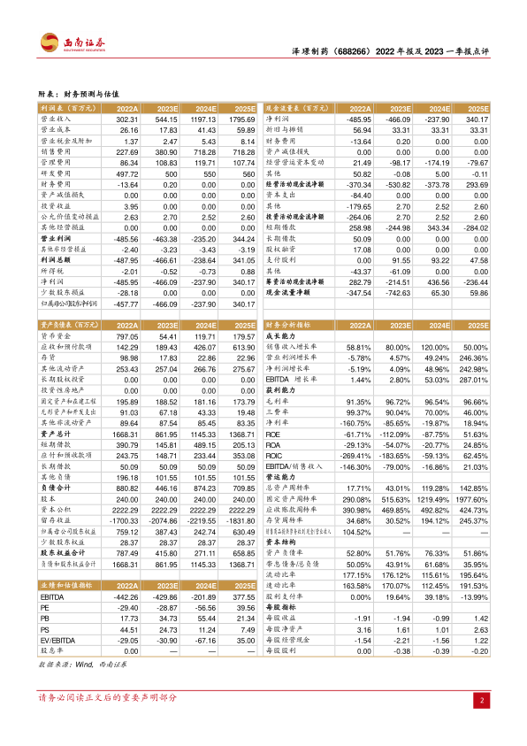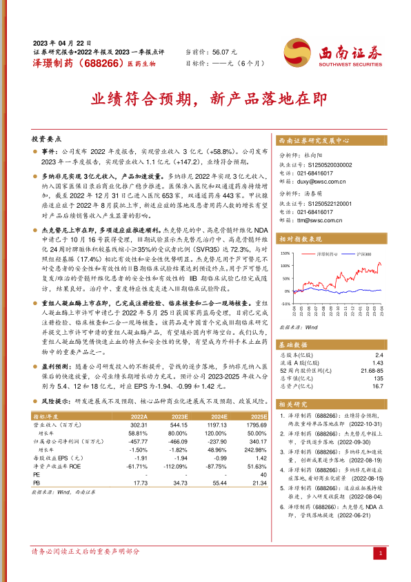 本报告分析了泽璟制药(688266)2022年报及2023年一季报,指出公司业绩符合预期,主要观点如下: