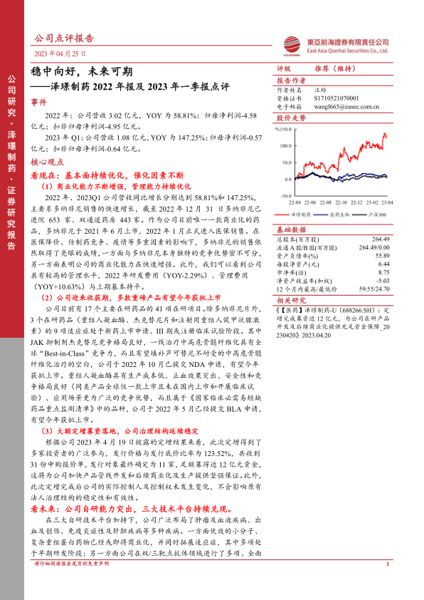 本报告对泽璟制药2022年年报及2023年一季报进行了深入分析,核心观点如下: