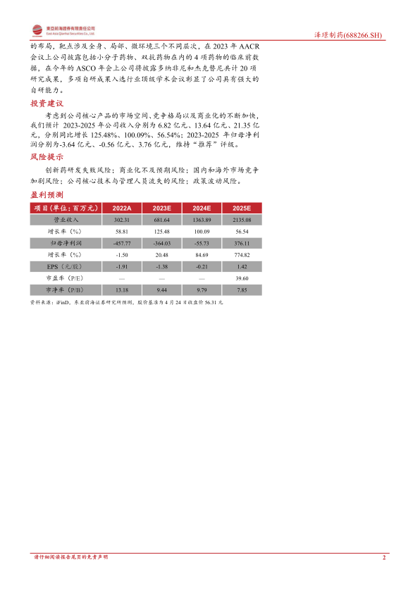 考虑到公司核心产品的市场空间、竞争格局以及商业化的不断加快,我们预计2023-2025年公司收入分别为6.82亿元、13.64亿元、21.35亿元,分别同比增长125.48%、100.09%、56.54%;2023-2025年归母净利润分别为-3.64亿元、-0.56亿元、3.76亿元,维持“推荐”评级。