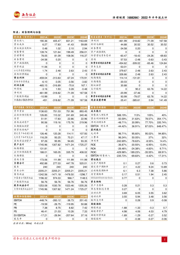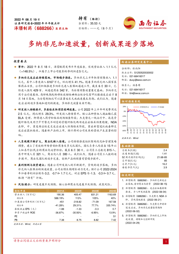 本报告对泽璟制药2022年半年报进行了解读,核心观点如下: