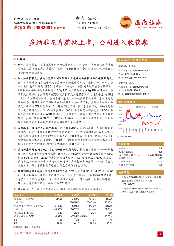 本报告对泽璟制药的多纳非尼片获批上市进行了深入分析,认为该产品凭借优异的临床数据和指南推荐,有望在肝癌治疗市场占据重要地位。同时,公司推出的股票激励计划也有助于激发员工积极性,促进公司业绩增长。维持“持有”评级,但需关注在研项目研发进度和销售推广能力。